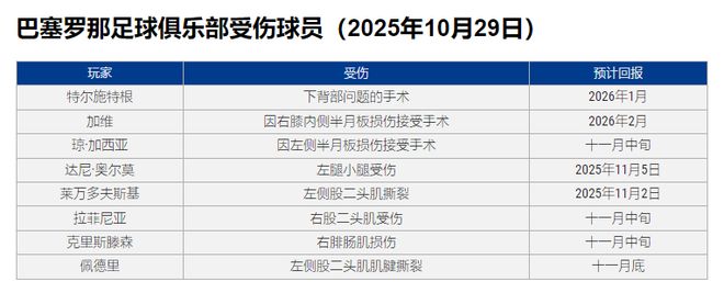 巴萨遭重创!中场大核伤停3周 伤病名单聚齐6大主力